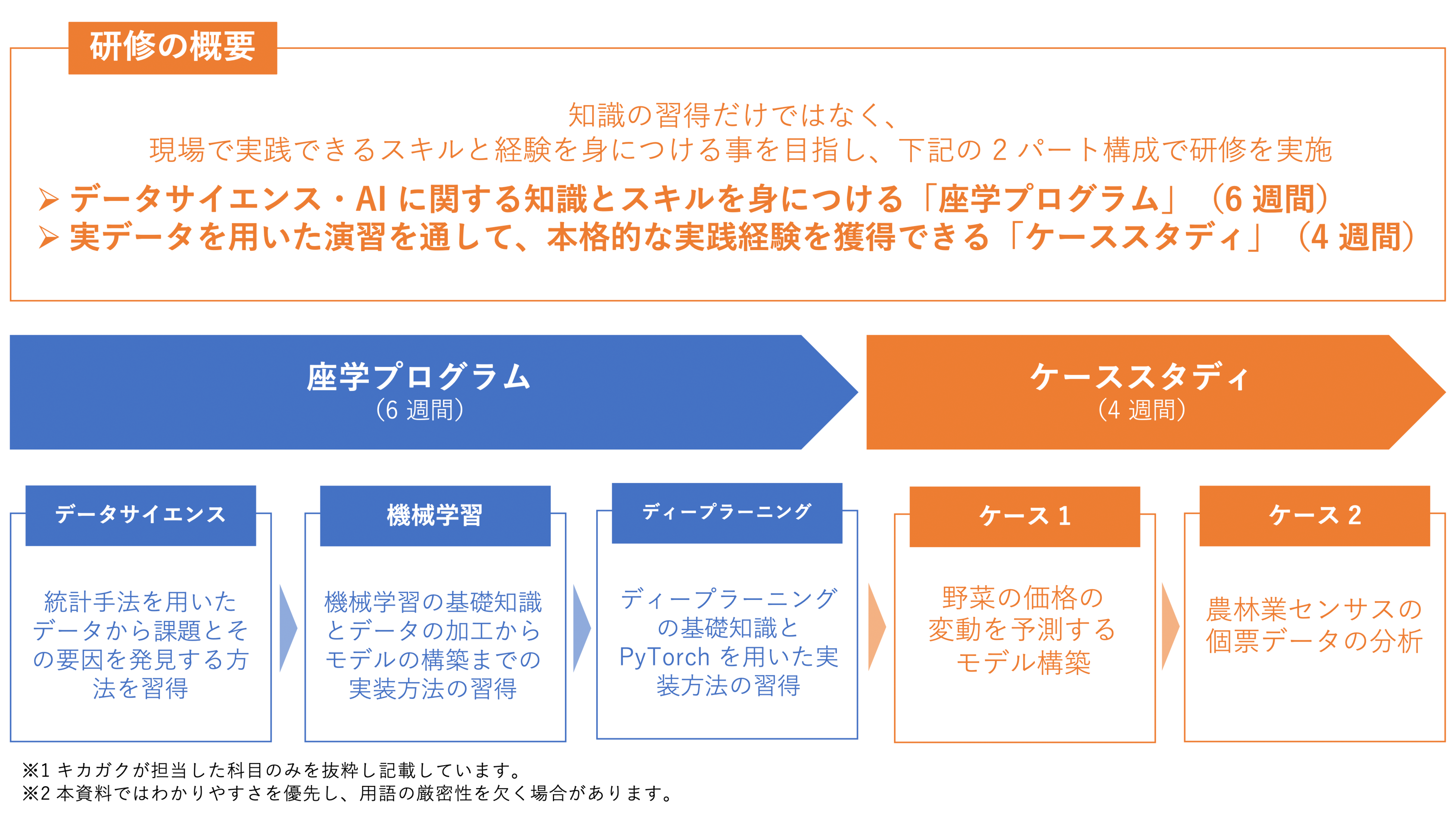 本研修は、知識を身につけるだけではなく、実践できるスキルと経験を身につける事を目指しており、データサイエンス・AI に関する知識とスキルを身につける「座学プログラム」(6 週間)と実データを用いた演習を通して、本格的な実践経験を獲得できる「ケーススタディ」(4 週間)の 2 パートから構成されています。