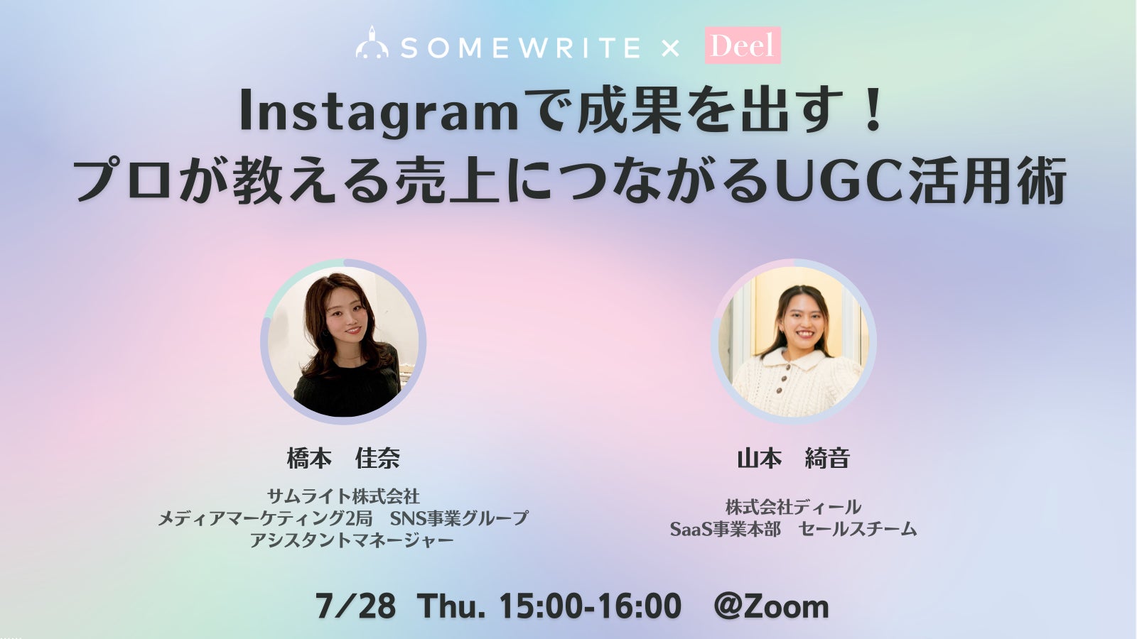 本セミナーでは、売上アップにつながるUGC(ユーザー生成コンテンツ)活用の成功例を数多く生み出しているディールと、さまざまな企業のInstagram活用を支援し自社でのInstagramメディア運営も行っているサムライトが、企業がInstagramを活用していくうえで重要なUGCについて、それぞれの知見を徹底公開。