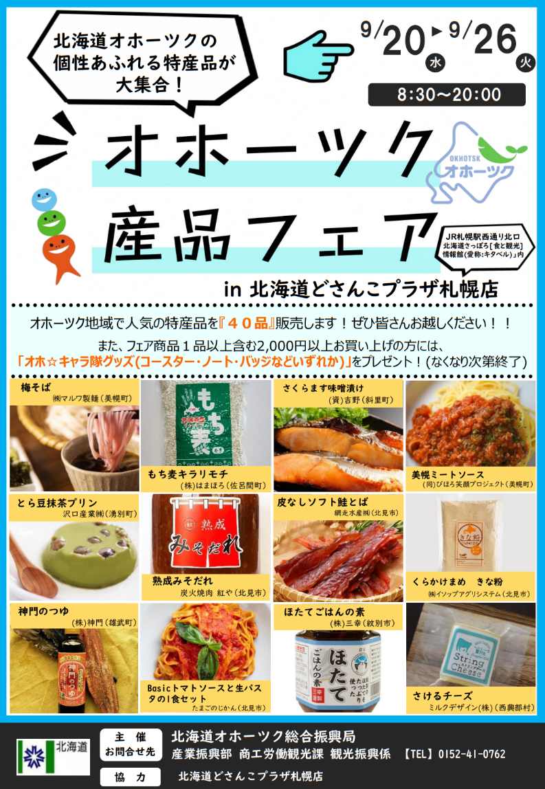 オホーツク総合振興局では、オホーツク地域の認知度向上や管内食関連事業者の販売機会の創出を支援するため、道央圏消費者に対し、北海道の公式アンテナショップ「北海道どさんこプラザ札幌店」において、オホーツクの食をPRするイベント「オホーツク産品フェアinどさんこプラザ札幌店」を開催します!