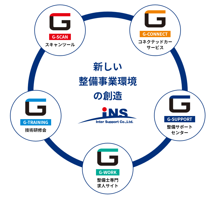 インターサポートはスキャンツールがより活用される環境づくりはもちろん、「確実な整備がどれだけ大切か?」「本当の安全・安心とは何か?」を深く考え、業界や自動車社会そのものに目を向け多角的にサポートする「5つのG」を掲げます。これは「G-SCAN」に加えてスキャンツールや整備に関する疑問に対応する「整備サポートセンター=G-SUPPORT」、自社のスキャンツールのプロが座学と実技を通して整備に関するノウハウを実践的に伝える「技術研修会=G-TRAINING」、車両・運行管理をする「コネクテッドカーサービス=G-CONNECT※開発中」、整備工場の採用問題と向き合う「G-WORK※準備中」の5つで、トータルサポートにより健全な整備業界と豊かな自動車社会を実現させます。