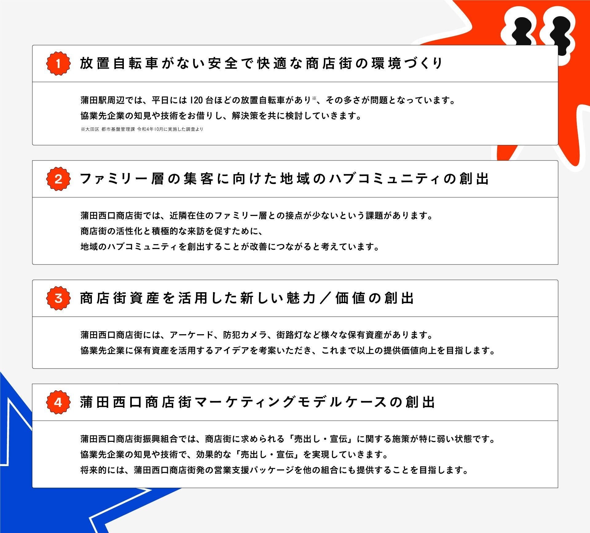 本プログラムは、商店街における課題の解決、新たな魅力の創出に向けた、東京都が推進する「未来を創る商店街支援事業」の一環です。プログラムの開始に伴い、2023年9月11日(月)より蒲田西口商店街との協業を目指す企業の募集を開始します。