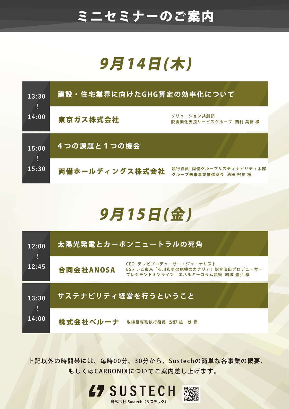 また、Sustechとの提携企業、Sustechサービスをご利用頂いている企業、そして脱炭素化に精通したジャーナリストをお招きして、脱炭素経営に関するミニセミナーを実施いたします。