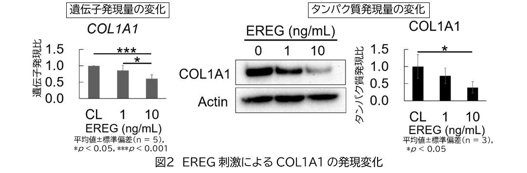 次に、EREGの組換えタンパク質を用いて、線維芽細胞のECM産生能へ及ぼす影響を検討した結果、コラーゲン繊維の構成成分であるCOL1A1の産生について、EREGによって濃度依存的に抑制される傾向が認められました(図2)。