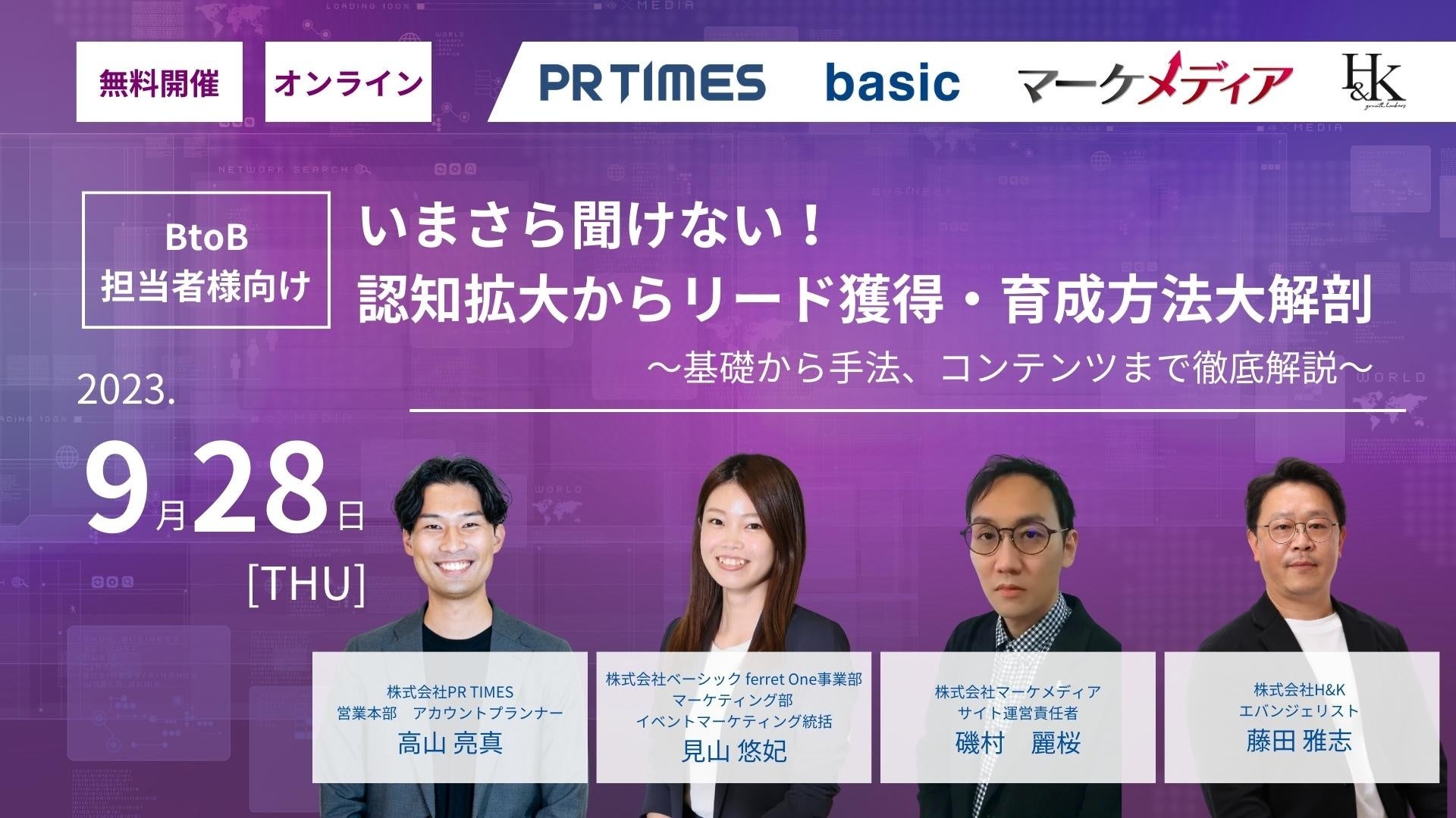 本セミナーでは、株式会社PR TIMES様、株式会社ベーシック様、株式会社マーケメディア様をお迎えし、BtoB事業における認知拡大からリード獲得・育成方法に関してお伝えします。