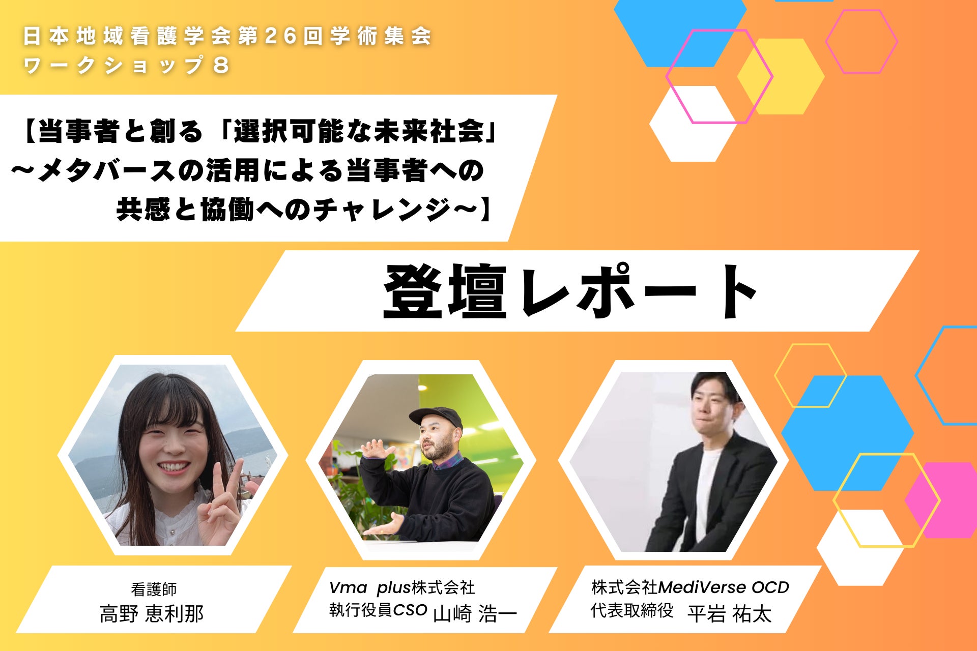 Vma plus株式会社の執行役員CSO山崎浩一が、日本地域看護学会第26回学術集会にて実施されたワークショップ【当事者と創る「選択可能な未来社会」~メタバースの活用による当事者への共感と協働へのチャレンジ~】に、医療メタバース「MEDIVERSECITY」を運営する株式会社MediVerse OCDの平岩氏、現在メタバース上でコミュニティを開拓する現役看護師の高野氏と登壇いたしました。