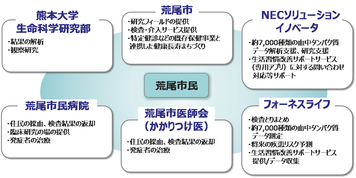荒尾市、熊本大学生命科学研究部、荒尾市民病院、荒尾市医師会、フォーネスライフ、NECソリューションイノベータは、産学官連携で荒尾市民の生活習慣の改善による健康増進をサポートし、市民の健康寿命の延伸や医療・介護給付費の増加抑制、荒尾市の持続可能な財政経営を目指します。