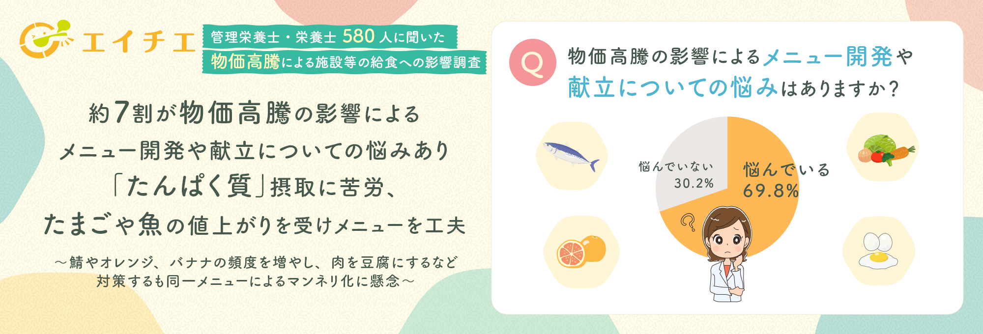 【主な調査結果】 2.物価高騰の影響によるメニュー開発や献立について約7割が悩みありと回答 3.理想的な給食を提供するためにはメニュー開発のスキルが足りないと半数以上が回答 4.物価高騰については8割以上が職場内で相談できているという実態 5.9割以上がたまご、魚類の値上がりを実感 6.たまごは2人に1人、果物は4人に1人、魚類は5人に1人が使用頻度を減らしている実態 7.使用頻度を増やしたい食材1位はたまご(42.1%)、2位は果物(41.9%)という結果 8.食材価格の変化によって起きたことは「同じ食材、メニューを使う頻度が増えた(50.0%)」が最多 9.物価高騰により栄養素基準値を満たすのに苦労するようになった項目は「たんぱく質(37.1%)」が最多 【コメント抜粋】 ②理想的な給食を提供するために足りないことについて ③物価高騰の対策として行っている工夫について |