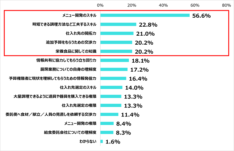 次いで「時短できる調理方法など工夫するスキル(22.8%)」「仕入れ先の開拓力(21.0%)」「追加予算をもらうための交渉力(20.2%)」「栄養食品に関しての知識(20.2%)」が上位だった。