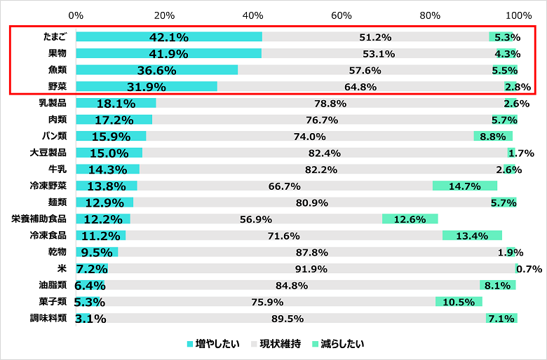 魚類(36.6%)、野菜(31.9%)も使用頻度を増やしたい食材の上位となった。