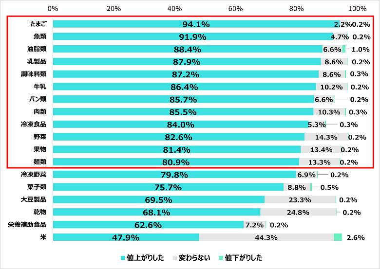 油脂類、乳製品、調味料類、牛乳、パン類、肉類、冷凍食品、野菜、果物、麺類は8割以上が「値上がりした」と回答。そのほか、冷凍野菜、菓子類など米以外の食材についても半数以上が値上がりを感じている。