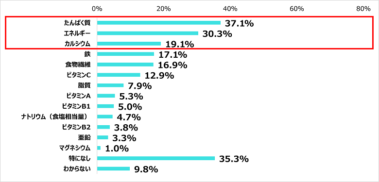 9.物価高騰により栄養素基準値を満たすのに苦労するようになった項目は「たんぱく質(37.1%)」が最多
