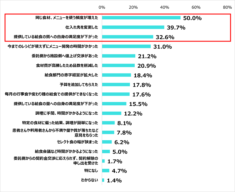 次いで「仕入れ先を変更した(39.7%)」「提供している給食の質への自身の満足度が下がった(32.6%)」が上位だった。