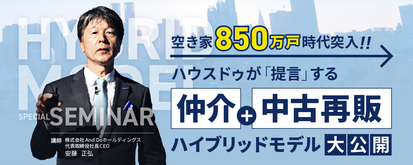 本格的な中古住宅の時代到来です。今や新築住宅市場は縮小し、住宅ストック数は850万戸を超え、世帯数を上回る過剰在庫で空き家が社会問題となっています。そこで、ハウスドゥでは、良質な住宅ストックの継承と流通に向け、戸建ての買取再販事業のさらなる強化をいたします。インフレや金利上昇を迎えた不動産業界のトレンドにご関心をお持ちの経営者様に、一代で東証プライム上場会社を育て上げたハウスドゥチェーン代表の安藤より今後の戦略を公開いたします。