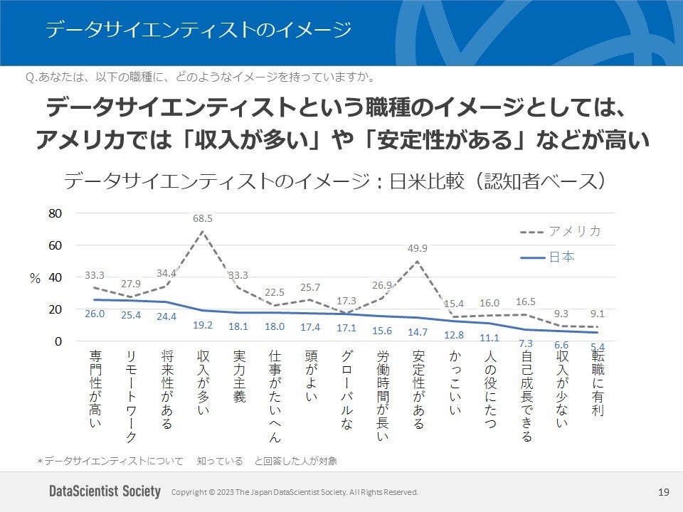 DSに対するイメージは、日本は「専門性が高い」、アメリカは「収入が多い」「安定性がある」が高水準