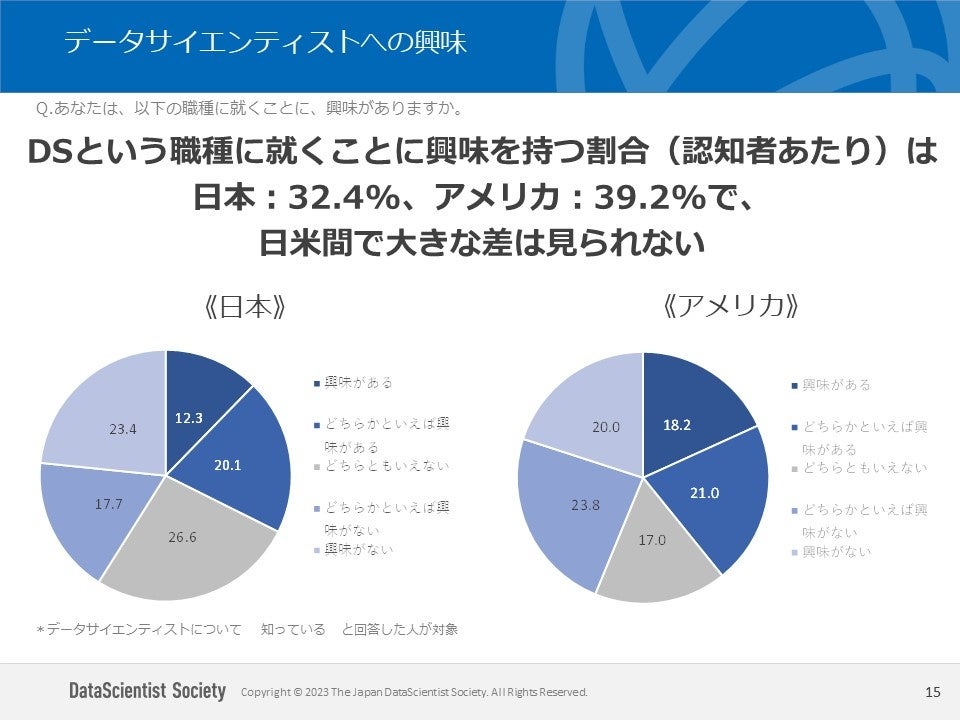 DSという職種に就労することへの興味は、日本:32.4% アメリカ:39.2%で、日米間の差は小さい