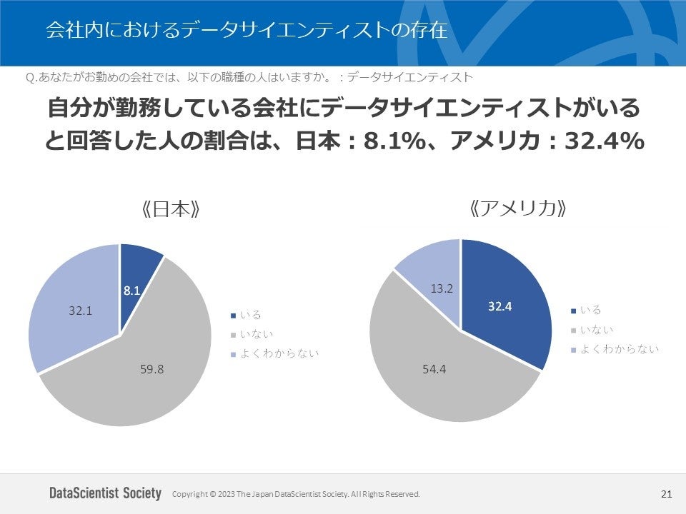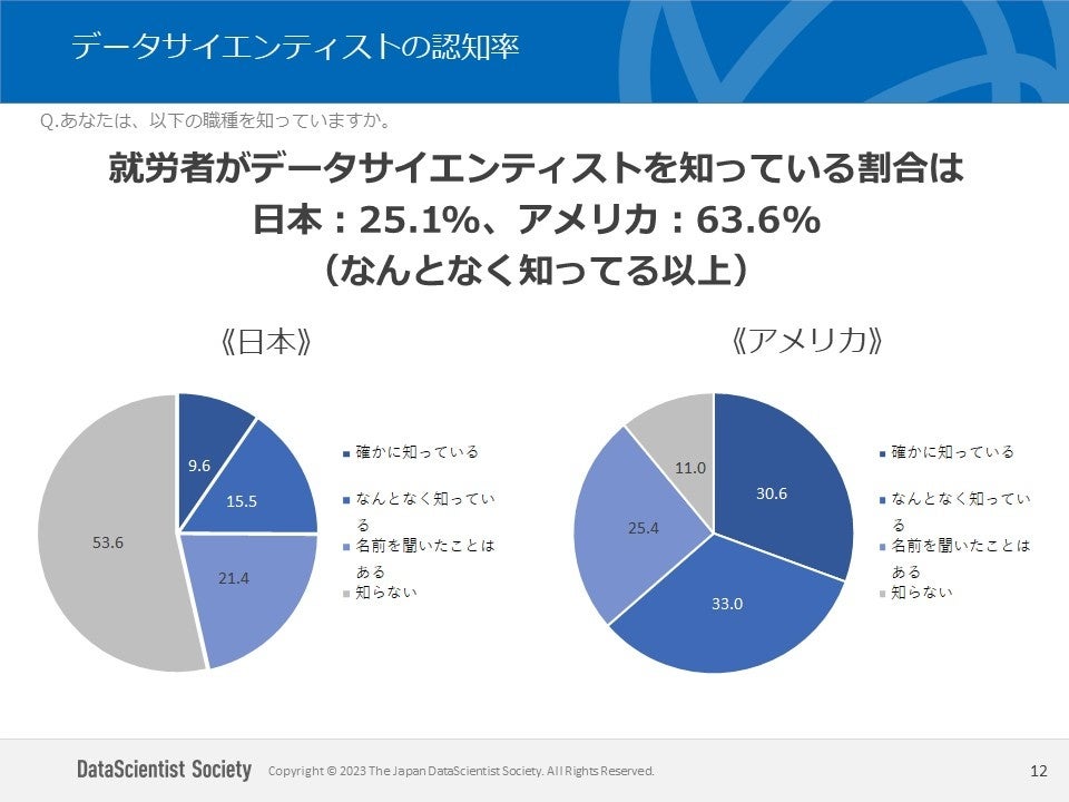「昨年は日本の一般ビジネスパーソンを対象に実施した調査を、2023年はデータサイエンス先進国のアメリカでも実施し、日米比較を行いました。DSの認知率、勤務している会社にDSがいる割合などは、アメリカと大きな差があることがわかりました。一方、DSに対する興味は日米での差が小さく、認知率などは徐々に高まってきており、これからのデータサイエンティストの活躍に期待が持てる結果になったと考えています。データサイエンティスト協会では、アメリカの水準を目指して、DSに関する適切な情報発信、人材育成の機会の整備、交流の場の提供などを行っていきたいと思います。」