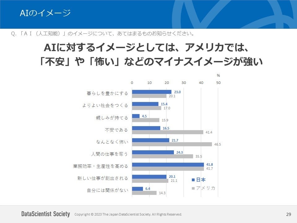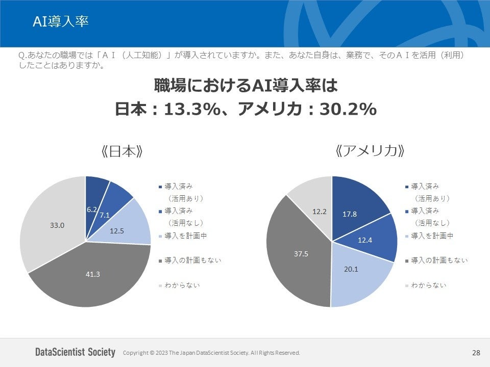 AIの仕事での導入率は、日本:13.3% アメリカ:30.2%で、アメリカでの導入が進んでいるが、AIに対して不安を感じている割合は、日本:16.5% アメリカ:41.4%となっており、日本ではポジティブに考えている人が多い