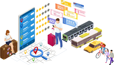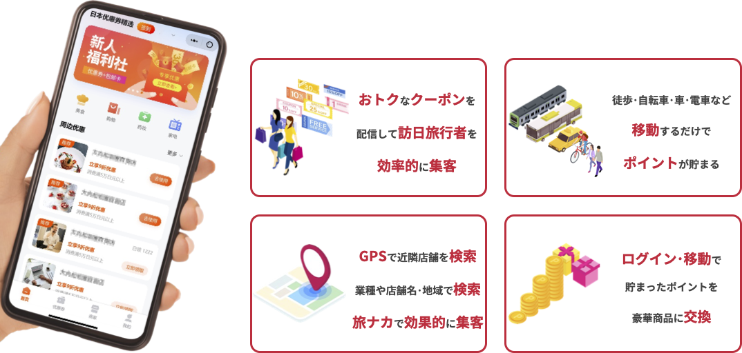 利用者は、集客メディアにログイン時、移動距離に伴いポイントを付与されます。ポイントは、メディア内に掲載される、日本の人気商品や地元限定のおみやげなどの景品と交換することができます。
