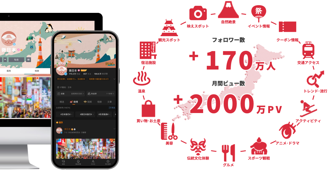 インバウンド関連事業では、日本企業および省庁や自治体のプロモーション支援を行っており、特に中国のデジタルマーケティング領域に精通しております。SNSの開設から運用、各種広告出稿、インフルエンサーマーケティング等、企画から運営、効果測定までワンストップで提供しております。日本最大級の訪日メディア「微日本」を運営し、“日本の代弁者”をコンセプトに観光・グルメ・ショッピング・美容・トレンド商品など中国本土に情報発信し続けており、Weibo内で影響力のある旅行関連アカウントTOP10にラインクインし続けております。
