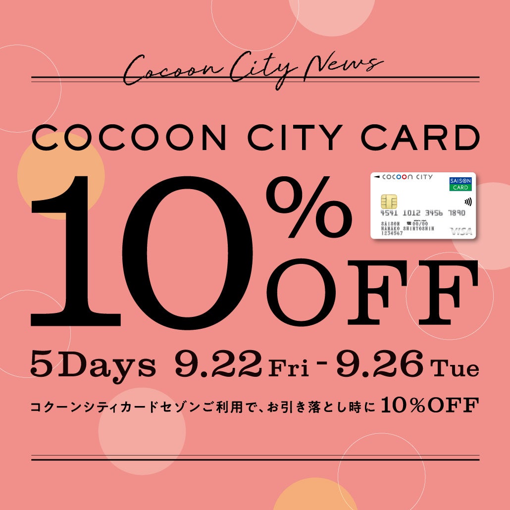 期間中、コクーンシティ内でのお買物やお食事にコクーンシティカードセゾンをご利用いただくと、お引き落とし時に10%OFF!
