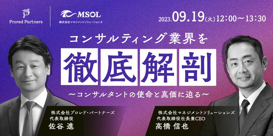 不況の中も成長が続く、コンサルティング業界。DX推進やコロナ時代への適応など、企業に対し多くの変化が求められる昨今、コンサルティングの需要も年々高まっていますが、お客様が求める価値を生み出せるコンサルタントがどのくらい存在するのか、という点で、その実情には疑問を呈さざるを得ません。本ウェビナーでは、コンサルタントとして企業価値の創出に貢献してきたMSOL高橋とプロレドの佐谷氏が、コンサルティング業界の現状と課題、および自らの経験も含めたコンサルタントとして果たすべき使命についてお話します。