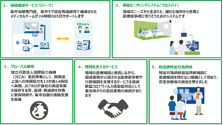私たちは、2016年のT-ICU(旧社名)創業以来、遠隔ICUによる診療サポートサービスを中心に医療において日本・世界へと幅広く事業を展開する中、2023年3月よりVitaarsに社名を変更致しました。 Vitaarsは、集中治療科医・集中ケア認定看護師のチームを擁する遠隔ICUサポートサービスの提供では日本で唯一の事業会社です。「世界中の人々に、最高の医療をAnywhere, we care. 」をミッションに、遠隔による診療支援・医療情報提供サービス・医療安全に関するコンサルティング等、専門知識と経験で医療現場を支え、患者・医療従事者・関わる人々の願いがかなう環境を目指しています。