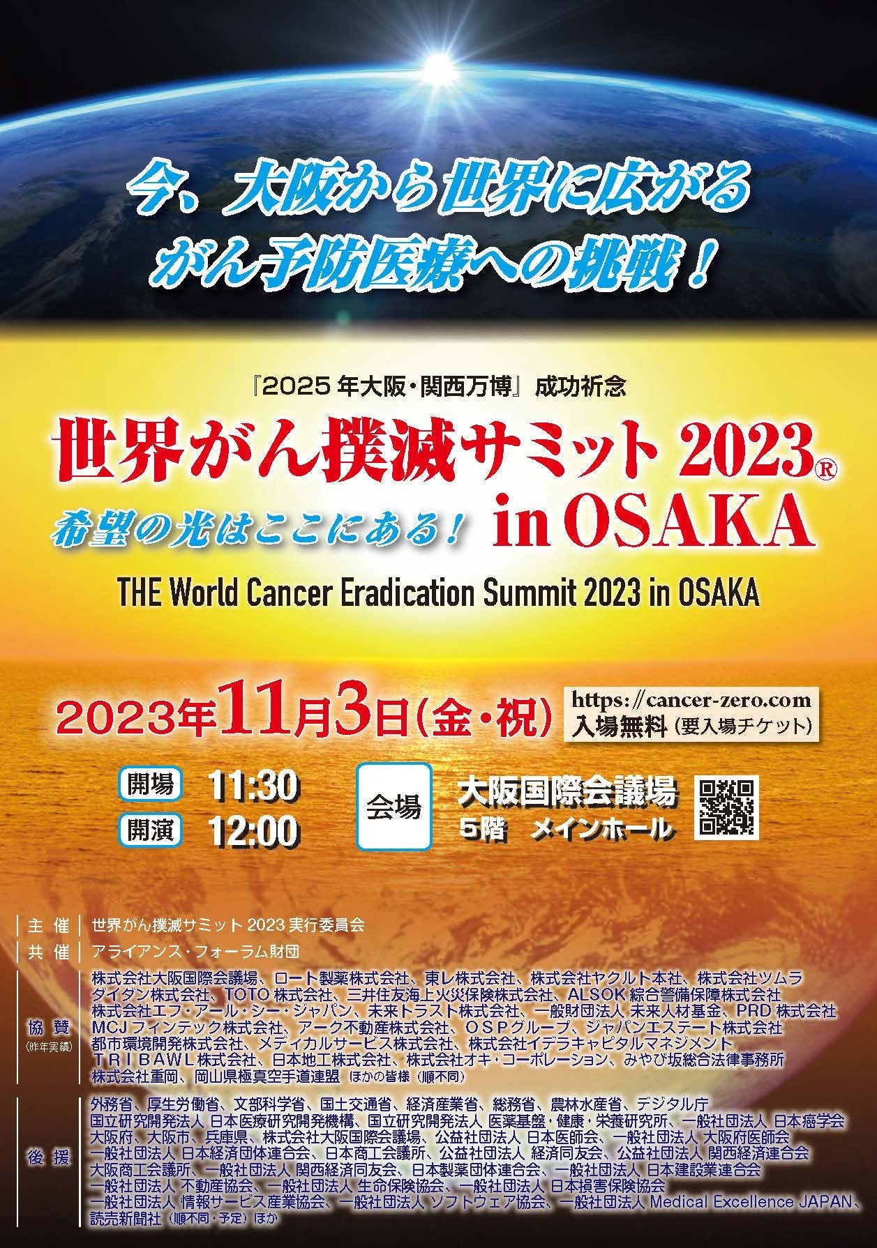 現在、『世界がん撲滅サミット2023 in OSAKA』入場エントリー(入場無料)を大会HP(https://cancer-zero.com)より受け付けている。一度に4名様までの登録が可能。応募多数の場合は抽選となる。