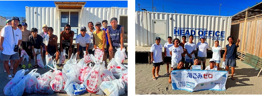 鎌倉由比ガ浜海岸では、白いコンテナをビーチクリーンの本部にして毎日16時からビーチクリーンを実施。コンテナの前面に「海と日本プロジェクト・CHANGE FOR THE BLUE」のバナーを掲出しました。