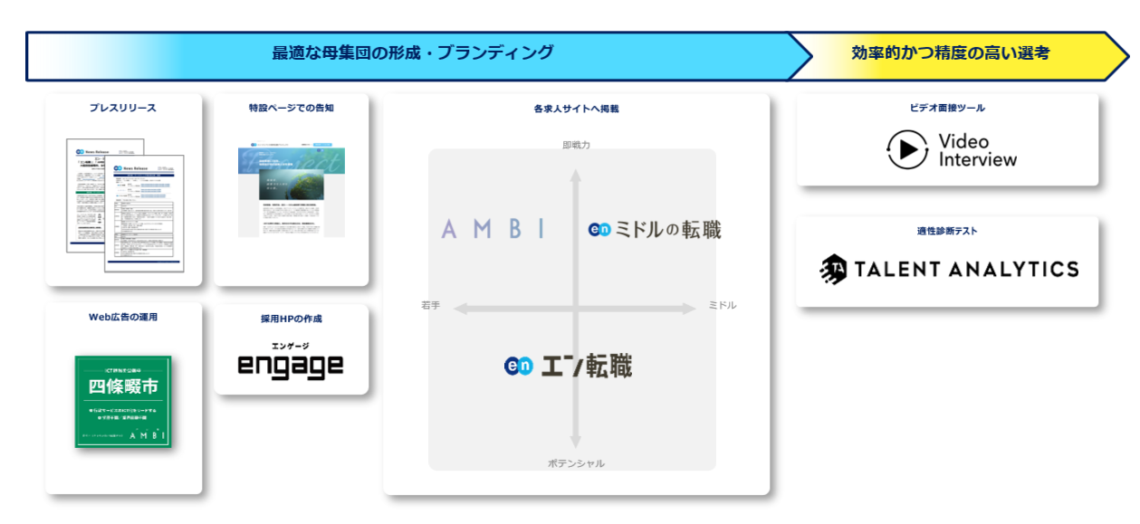 プレスリリースや特設ページ、採用HPの作成、Web広告での告知に加え、各求人サイトでの集客サポートを実施。『エン転職』『AMBI』『ミドルの転職』とターゲットの異なる3つの求人サイトを活用することで、ターゲットへ網羅的に求人を届けました。また、ビデオ面接ツール『Video Interview』、適性診断テスト『Talent Analytics』も提供。選考フローの支援を通じて、求職者と同市の最良なマッチングを実施しました。