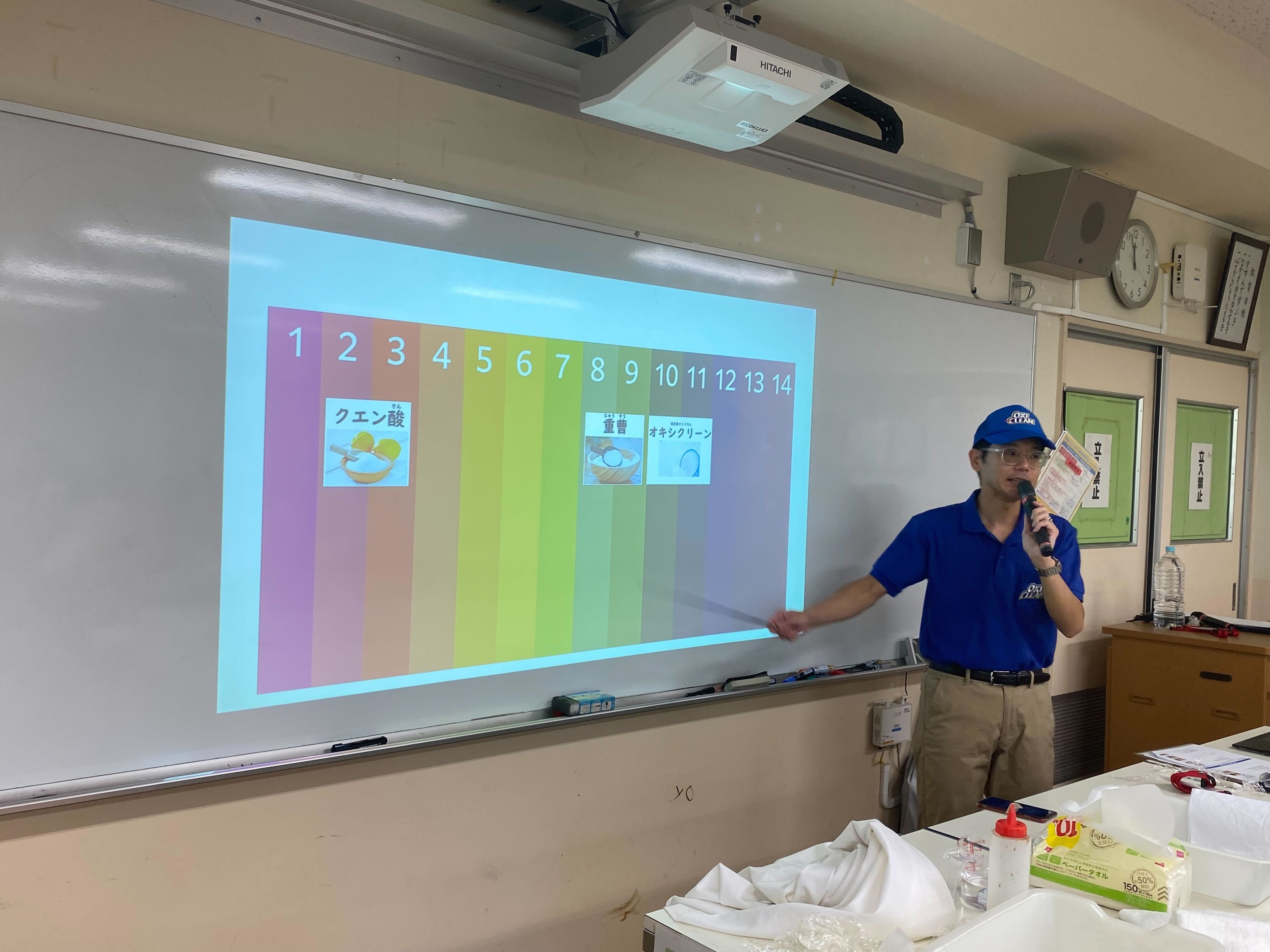 本授業は、“身近な汚れを落とす「掃除・洗濯」” という行為がどのくらい環境に影響を与えるのか学び、環境に与える負荷を減らすための工夫をひとりひとりが考えることを目的として行われました。