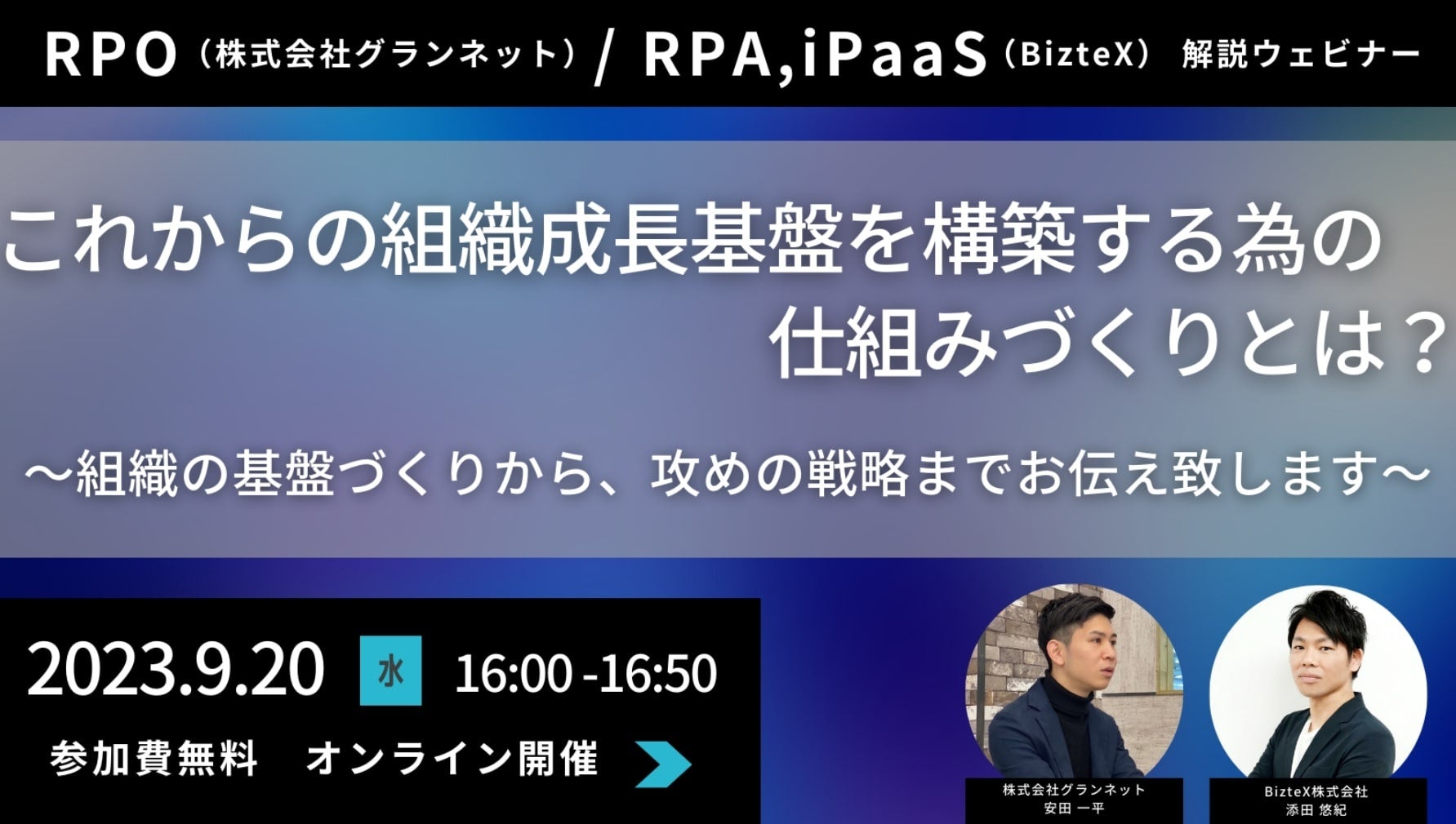 SEOコンサルティング等のデジタルマーケティングや採用代行サービスを提供している株式会社グランネット(本社:大阪府大阪市 代表取締役:山本 真俊)は、9月20日(水)16:00-16:50にBizteX株式会社(本社:東京都新宿区 代表取締役:嶋田 光敏)と共催で「組織づくり・戦略」に関する無料ウェビナーを開催いたします。