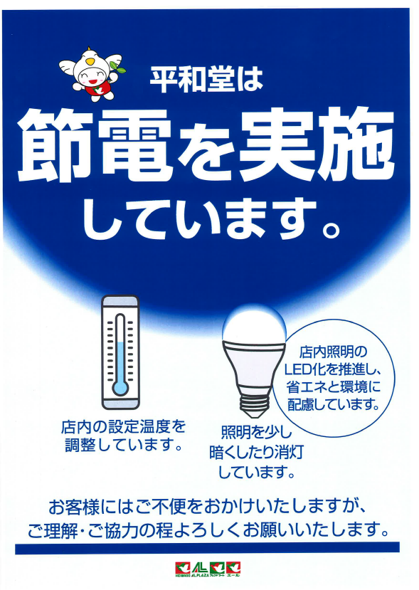 平和堂・エールは、サステナビリティの観点からかねてより店内照明のLED化や省エネ設備への投資などの節電・省エネ対策を実施しております。この5月からは、電力需給逼迫への対応として店内風除室や後方の照明のこまめな消灯、店内空調設定温度の徹底や運転時間の調整、冷ケースの設定温度の徹底や清掃等を実施してまいりました。