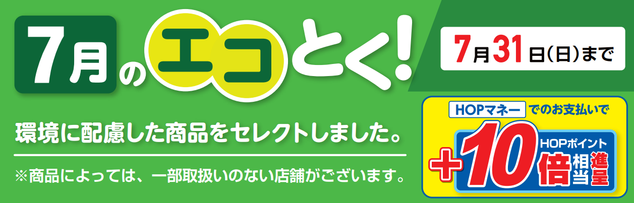 月ごとに、食品や住居関連品を中心に環境に配慮した商品をセレクトし、「エコとく!」としてご紹介しており、HOPマネーでのお支払いで10倍ポイント相当を進呈しております。