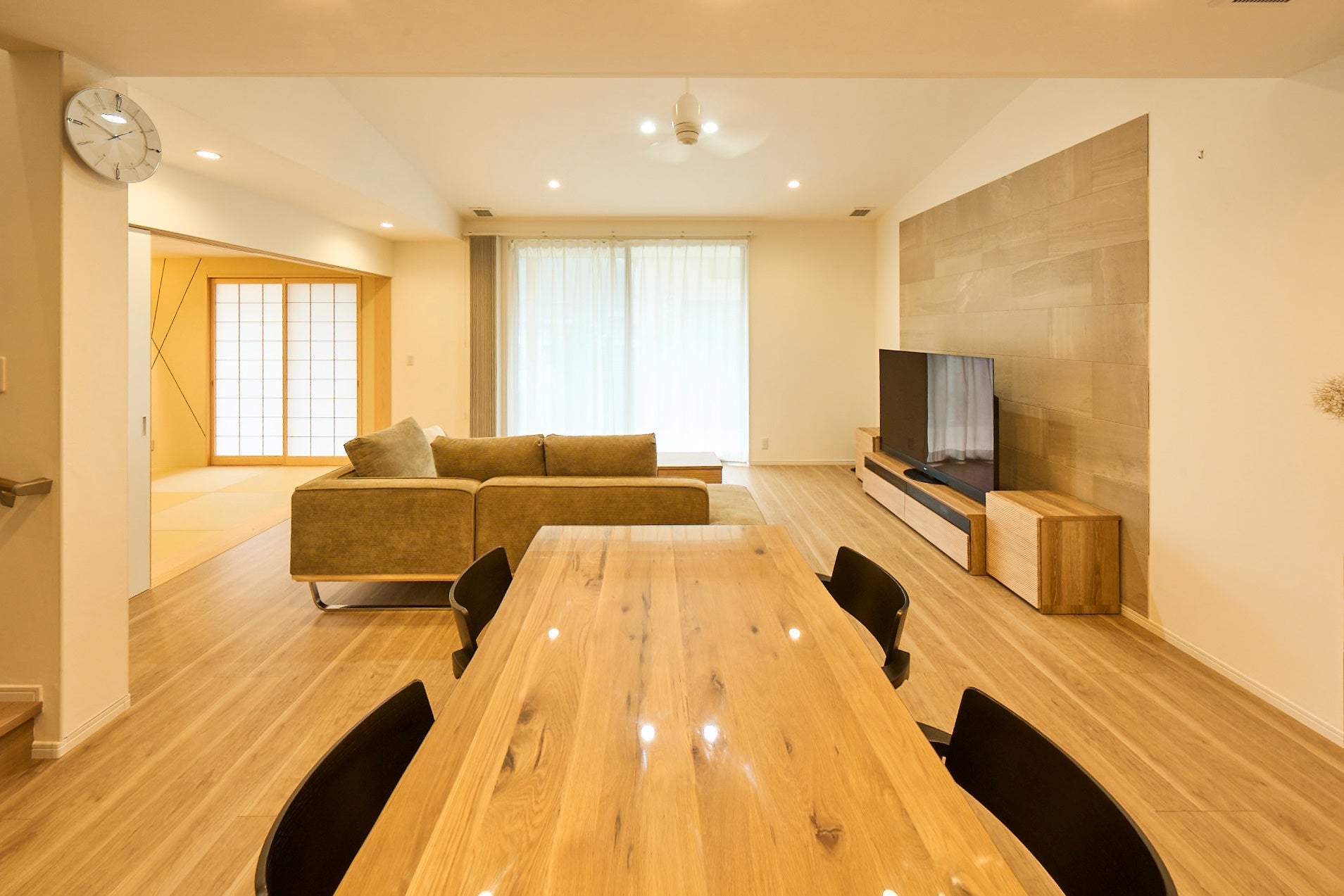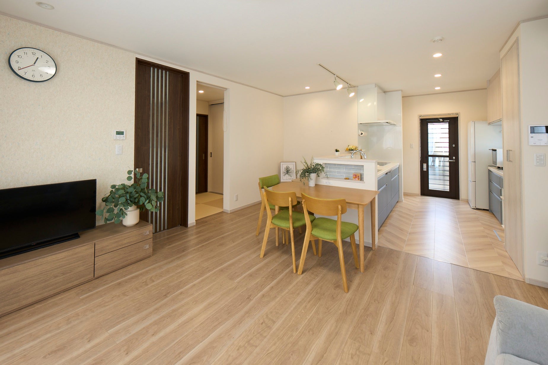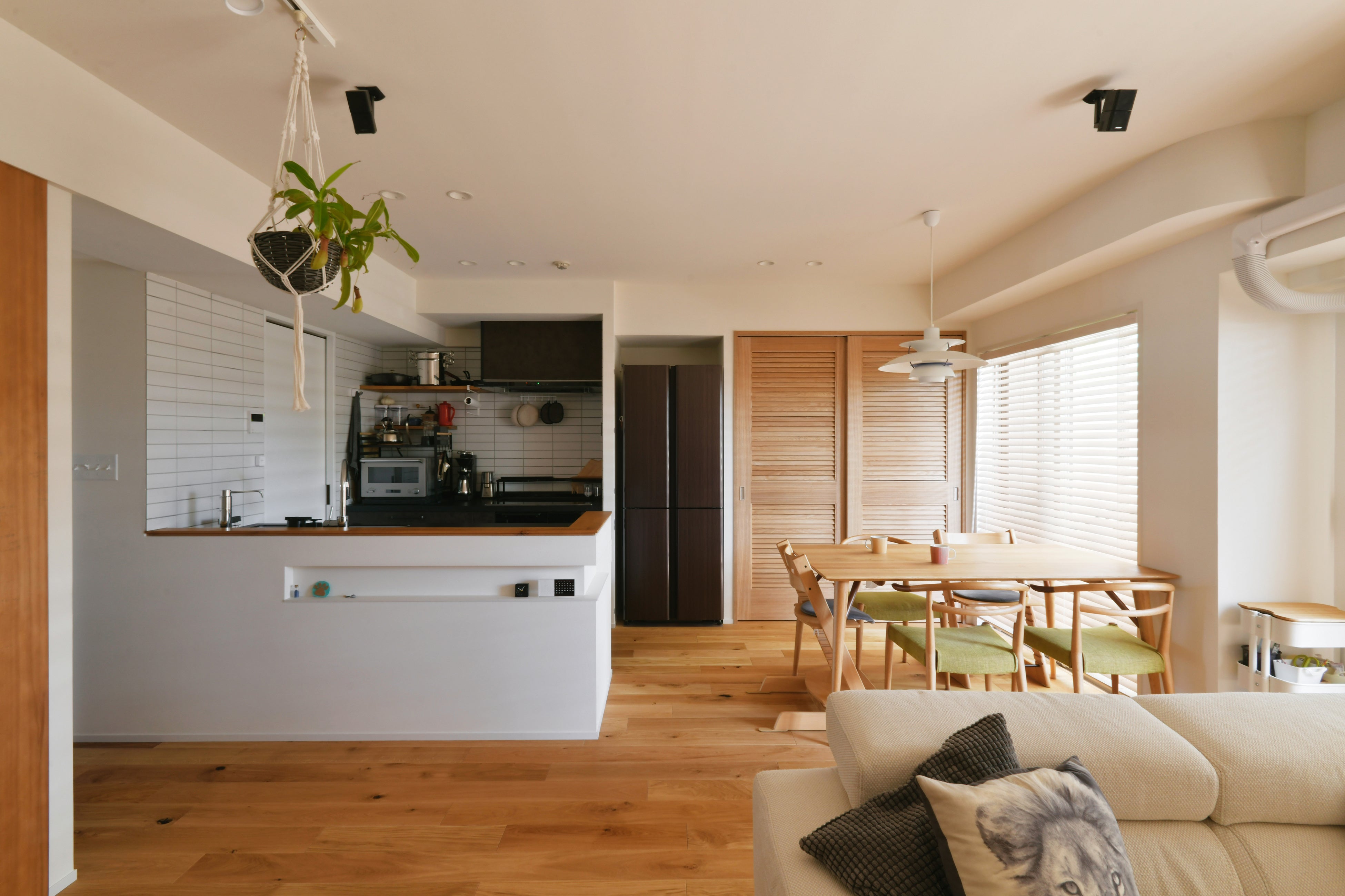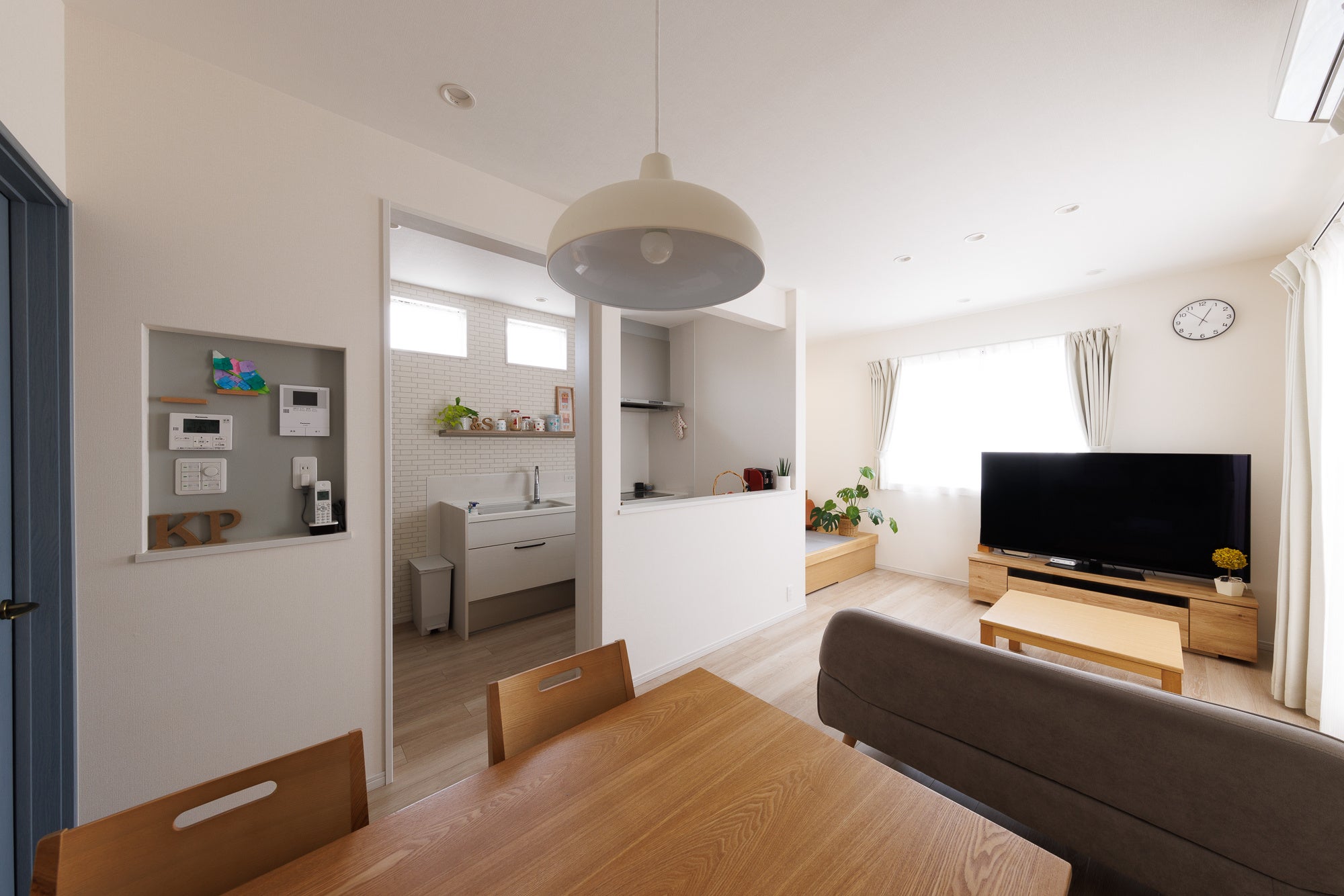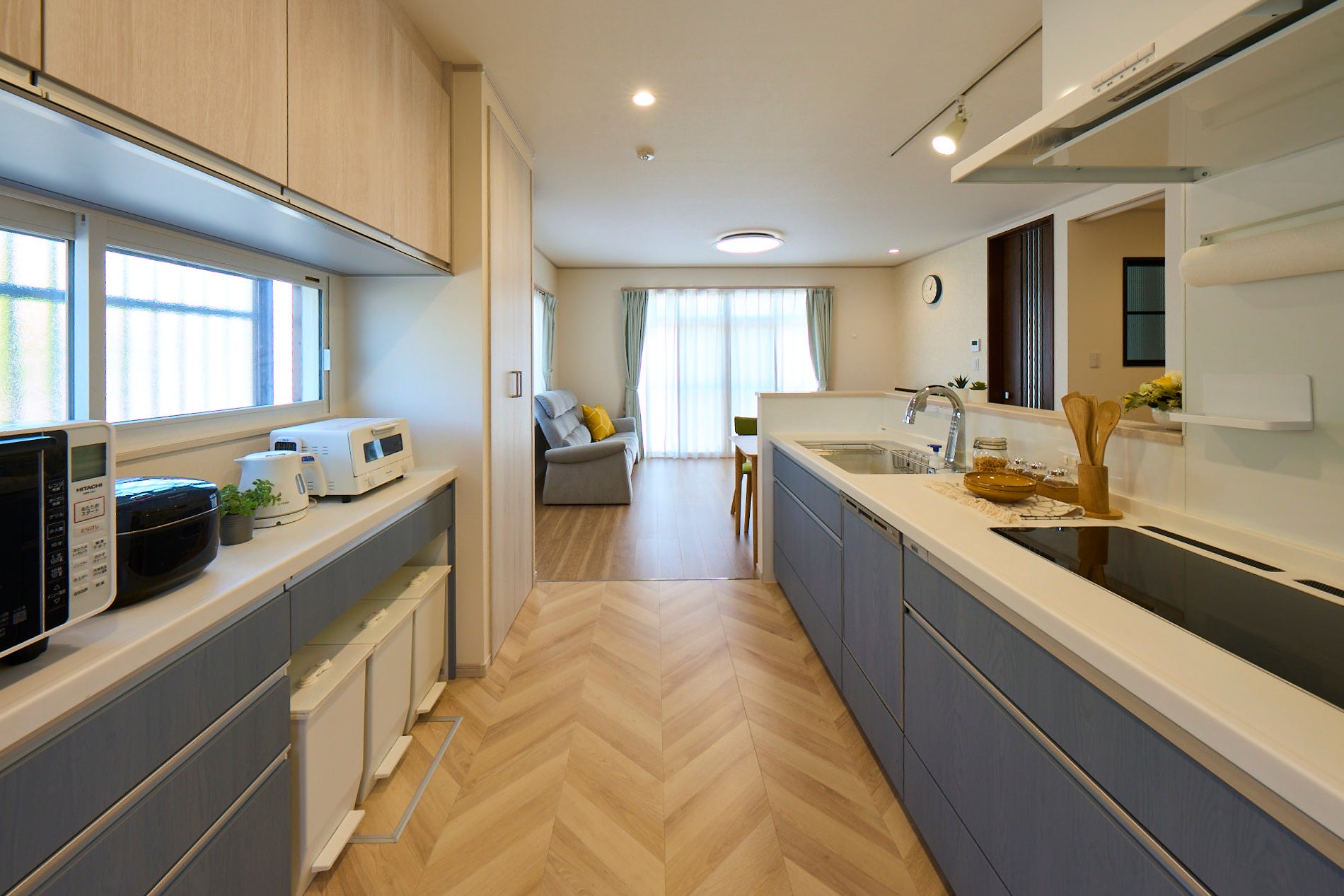 評価ポイント:広々としたフリースペースを設け、優しい色合いのインテリアで子どもがキッチン周辺で心地よく過ごすことができるように配慮された子育て世帯空間。リビングに対し、縦方向の2型キッチンで使い勝手の良さを実現。