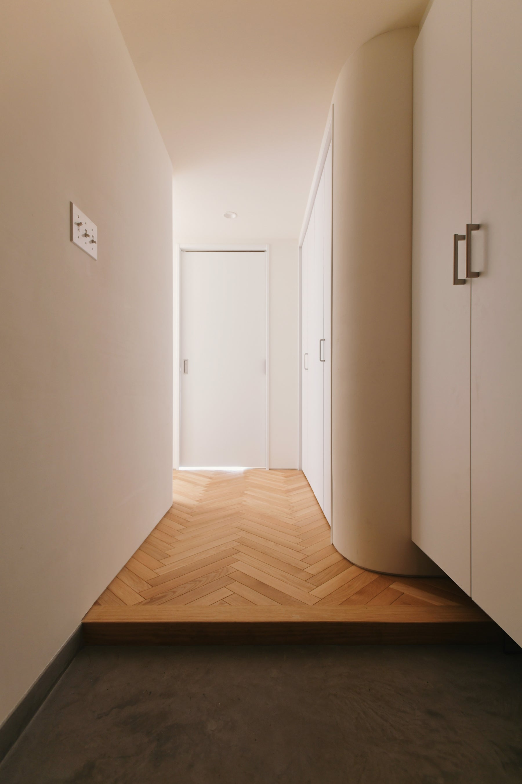 評価ポイント:梁や廊下の壁に曲線を取り入れた優しいデザイン。住戸の中央に廊下を再配置。各個室とLDKがつながるように家族間のブライバシーも確保。調湿効果のある珪藻土(けいそうど)仕上げの天井、エコ素材の壁紙など、暮らしの心地よさに配慮。