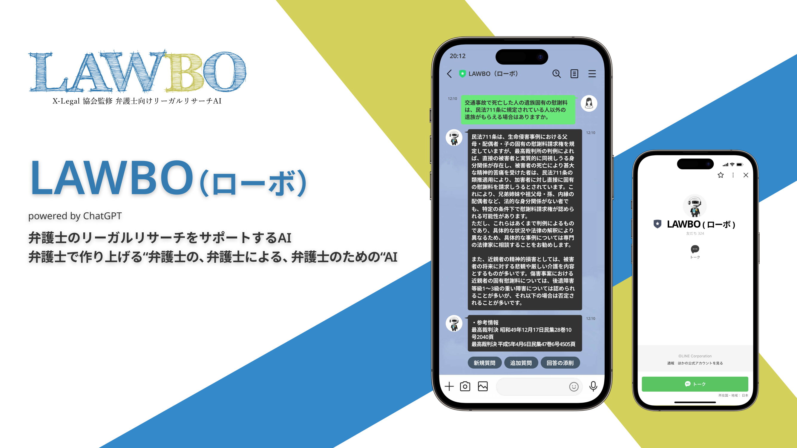 弁護士の主たる業務であるリーガルリサーチをサポートするAIです。弁護士に、AIをより身近で、使いやすい存在として感じてもらうために、まずはLINEアプリにて無償提供いたします。