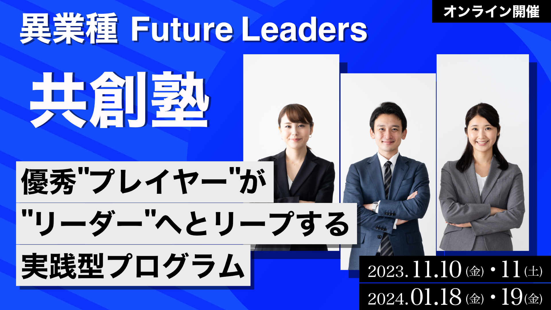 一方「異業種 Future Leaders 共創塾」では、“将来のリーダー”に対してリーダーシップの根幹となる“気づき”を得ていただくことを主目的にしています。「いち早く、プレイヤー(“個”)にとどまらず、“組織”を率いてパフォーマンスを発揮するリーダーとなってほしい」という想いで誕生した“将来のリーダー”向けプログラムが「異業種 Future Leaders 共創塾」です。