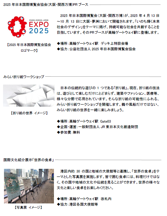 2024年度末のまちびらきに向け準備を進めている「TAKANAWA GATEWAY CITY」では、エキマチ一体の街として高輪エリアや品川・湾岸エリア、日本各地、世界中のヒト・モノ・コトをつなぎ、新しい街や周辺エリアに賑わいや憩いの空間を生み出します。今回、高輪ゲートウェイ駅では、新しいエキマチの世界につながるコンテンツを実施します。