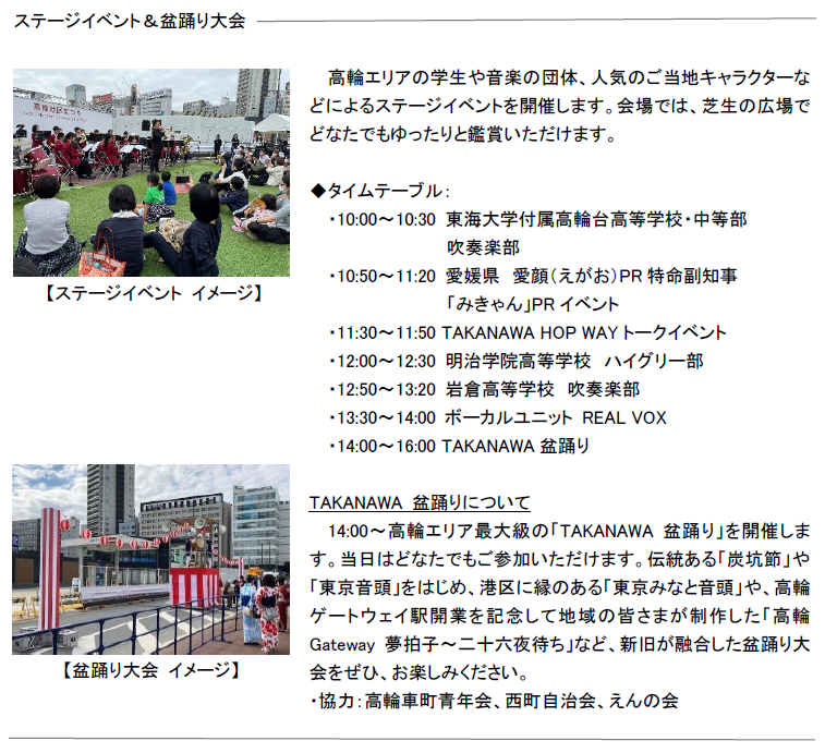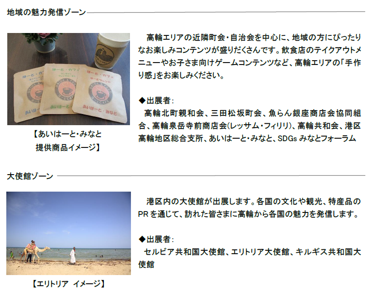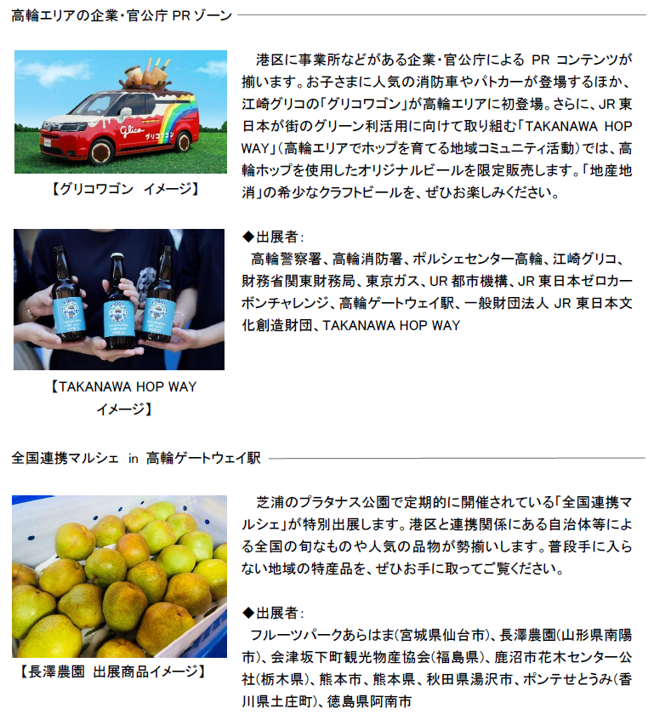 高輪エリアの事業者・学校・大使館、全国の自治体と協力し、「地域連携」「地域の魅力発信」「防災」をテーマに多様なブース出展・ステージイベントを行います。高輪ゲートウェイ駅前道路(補助332号線)から、高輪エリアの魅力や日本の豊かさを訪れた皆さまに発信します。