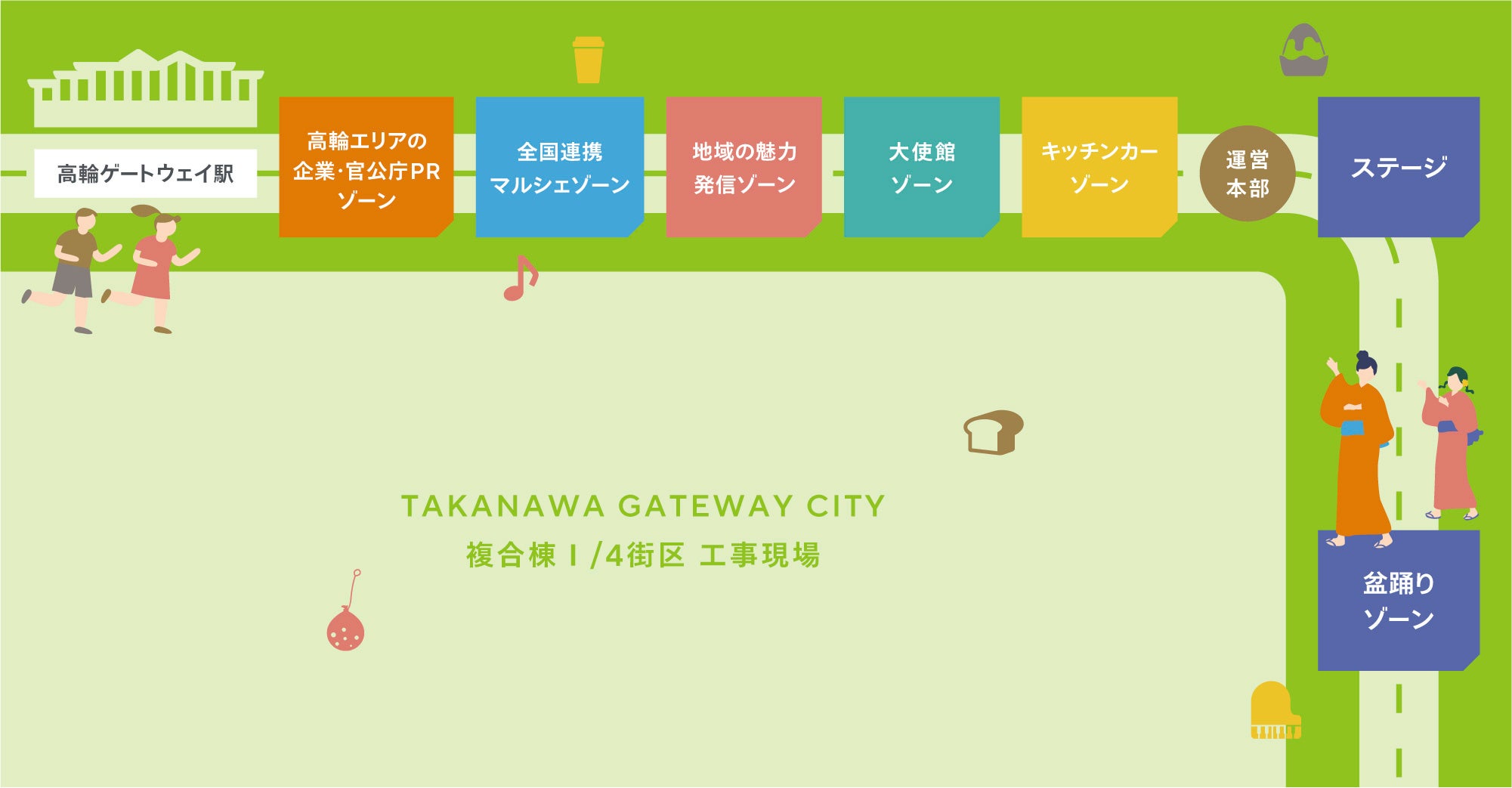〇一般社団法人高輪ゲートウェイエリアマネジメント(東京都港区、代表理事:髙木 浩一)、東日本旅客鉄道株式会社(本社:東京都渋谷区、代表取締役社長:深澤 祐二、以下「JR東日本」)は、2023年10月29日に高輪ゲートウェイ駅前道路(補助332号線)および駅を中心として、エリア連携イベント「高輪地区まつりwith TAKANAWA GATEWAY CITY」(以下「本イベント」)を開催します。 〇本イベントでは「つながる」をテーマに、高輪ゲートウェイ駅周辺地域の事業者・学校にとどまらず、品川・湾岸エリアとも連携し、同エリアの魅力を一体で発信します。また同エリアから日本各地・世界と「つながる」多様なイベントコンテンツも実施します。 〇品川開発プロジェクトとして、まちびらきに向け準備を進めている「TAKANAWA GATEWAY CITY」の中心となる高輪ゲートウェイ駅を起点に、高輪エリアおよび周辺の品川・湾岸エリアのにぎわいを創出していきます。 |