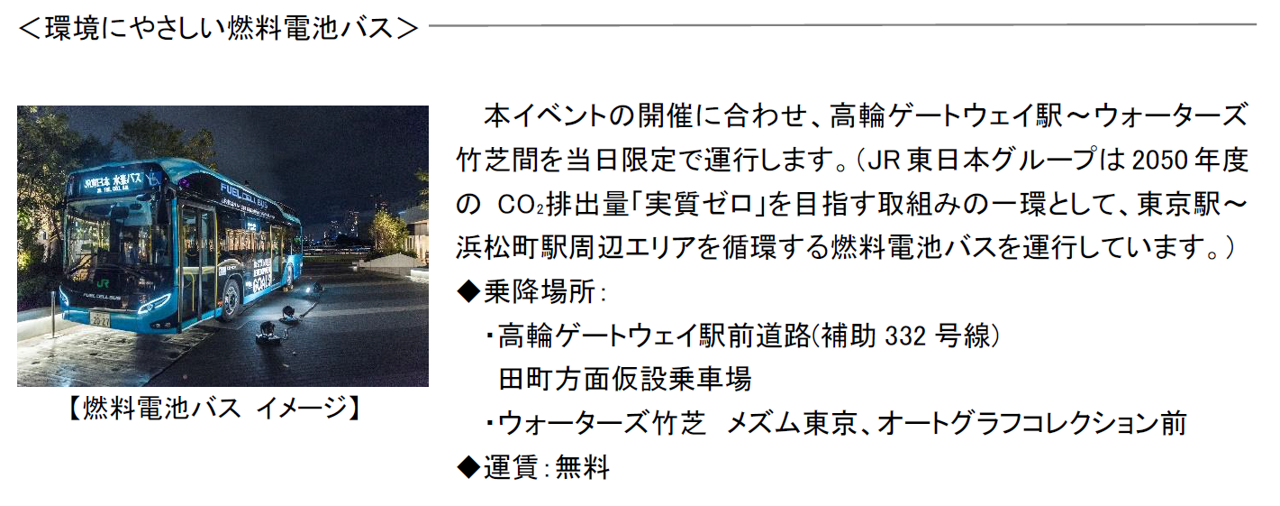 高輪ゲートウェイ駅を中心にJR品川駅やウォーターズ竹芝をつなぎ、品川・湾岸エリアの各スポットを楽しみながらめぐっていただける周遊スタンプラリーを開催します。イベント当日は高輪ゲートウェイ駅とウォーターズ竹芝間を燃料電池バスが1日限定で運行します。
