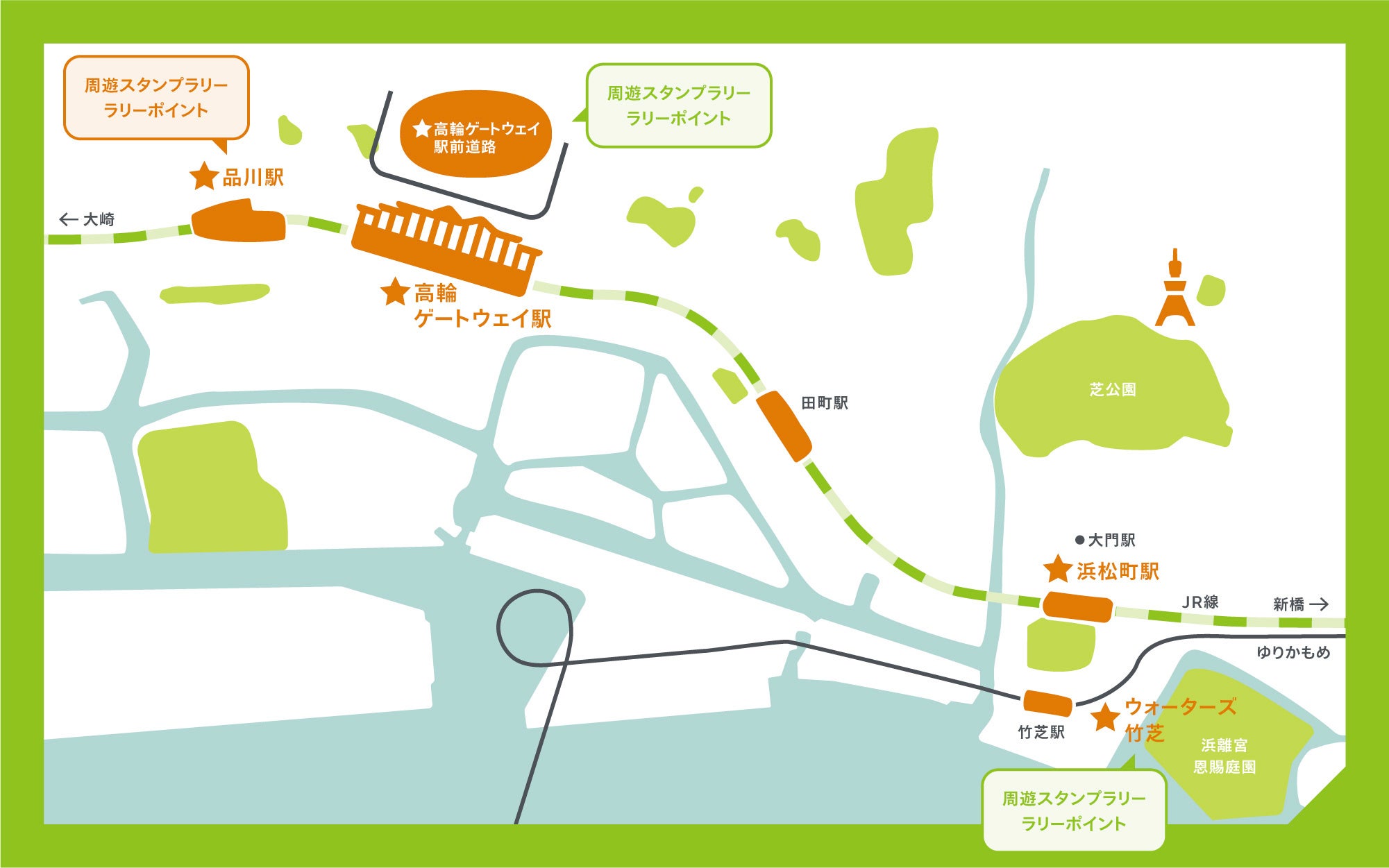 ・高輪ゲートウェイ駅前道路(補助332号線)、JR品川駅、ウォーターズ竹芝に設置された5つのラリーポイントをめぐるスタンプラリーを開催します。