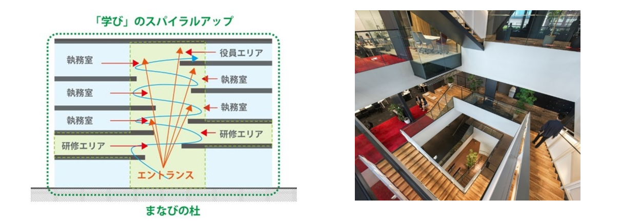 ビル全体を「まなびの杜」として樹々に見立て、吹き抜け部分を大きな幹とし、各フロアを枝が伸びるような構成になっています。スキップフロアを設ける事で空間の一体性を生み出し視覚的な接点も創出します。エントランスから見上げると学びの情景を共有でき、教育研修に対する社員の意識向上に着目し、研修や教育に限らず社員同士、来訪者も含めたコミュニケーションの向上や一体感を醸成できる内部空間構成となっています。