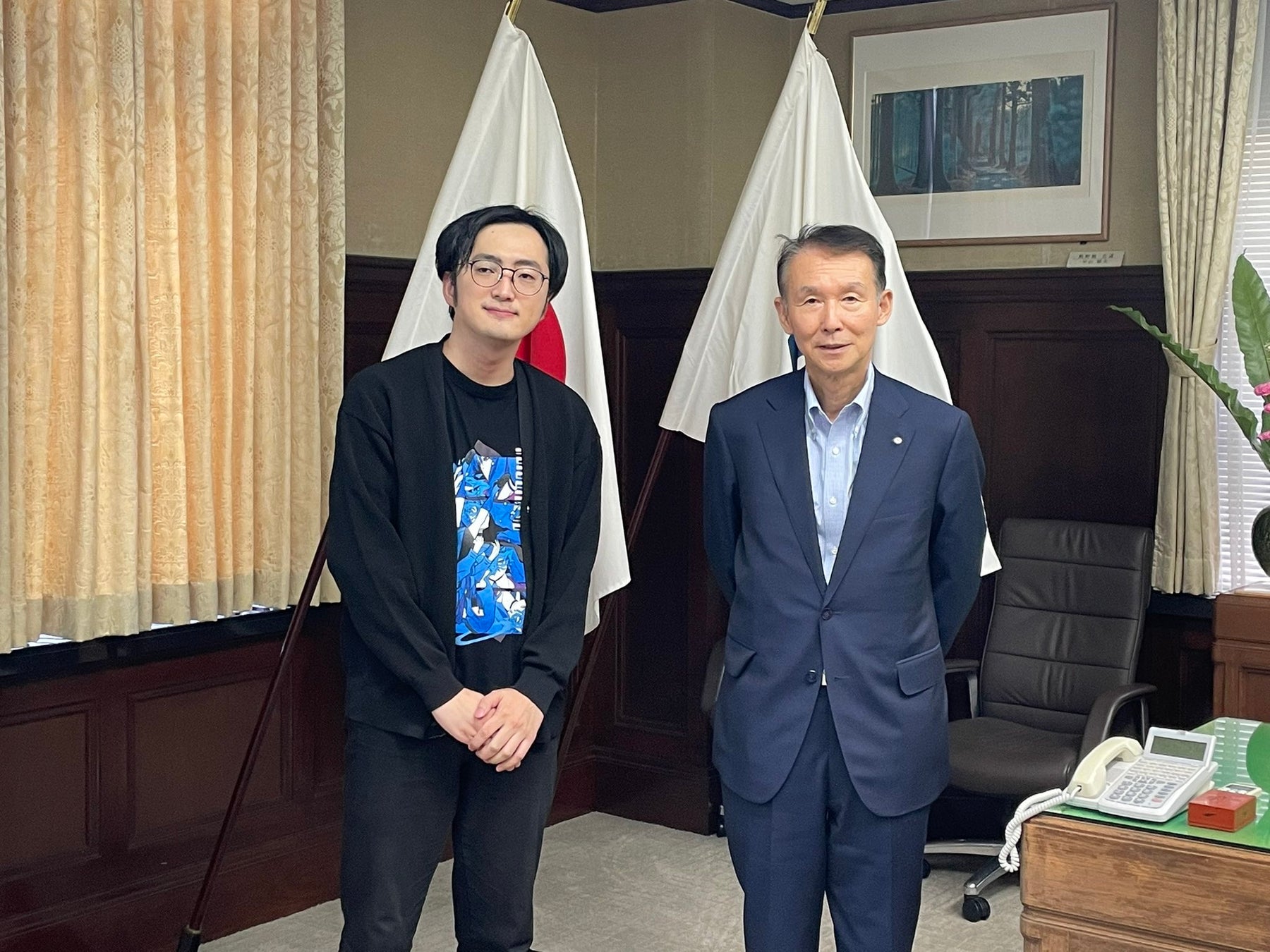 (左 小幡和輝 株式会社ゲムトレ代表取締役 右 岸本周平和歌山県知事)