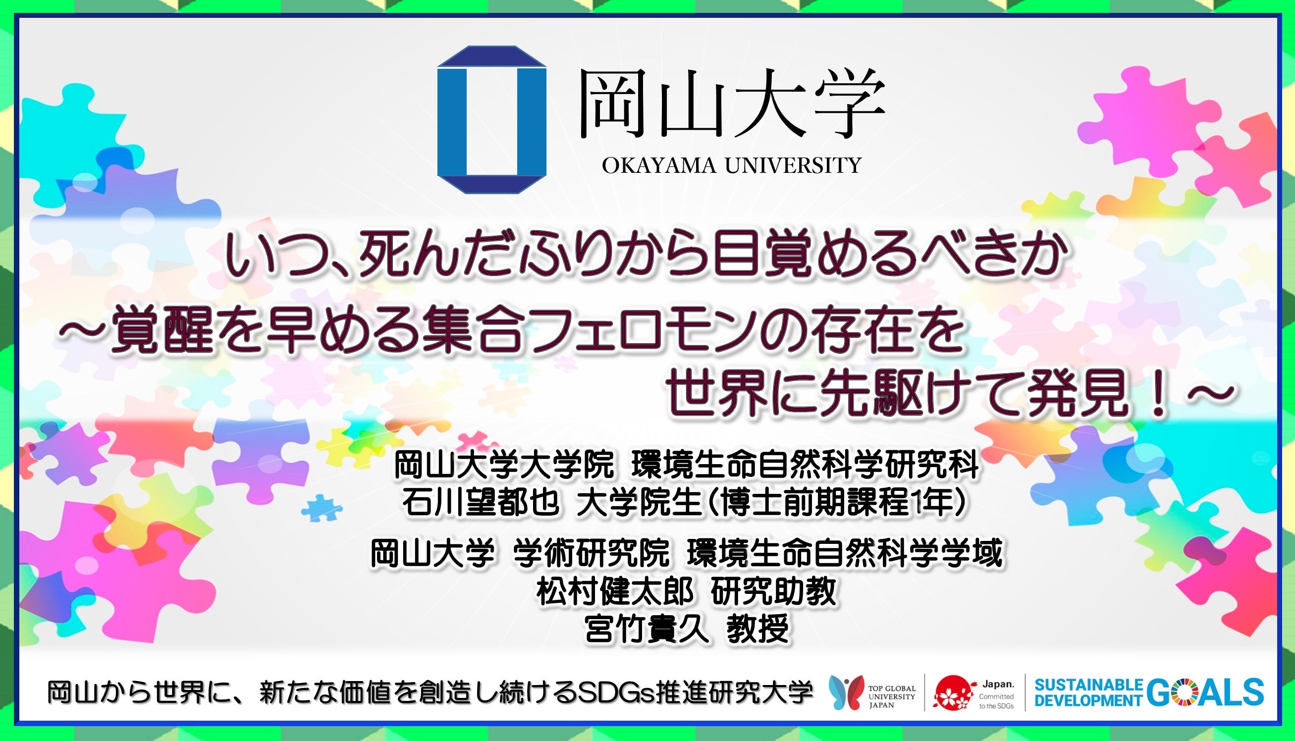 国立大学法人岡山大学(本部:岡山市北区、学長:那須保友)の大学院環境生命自然科学研究科の石川望都也大学院生(博士前期課程1年)と岡山大学学術研究院環境生命自然科学学域の松村健太郎研究助教、宮竹貴久教授の研究グループは、コクヌストモドキ(Tribolium castaneum)という貯穀害虫を用いて死んだふり行動から覚醒する刺激について調べました。その結果、死んだふりをしている成虫を、同種の集合フェロモンの匂いにさらすことで死んだふりから覚醒するまでの時間が短くなることを新たに発見しました。