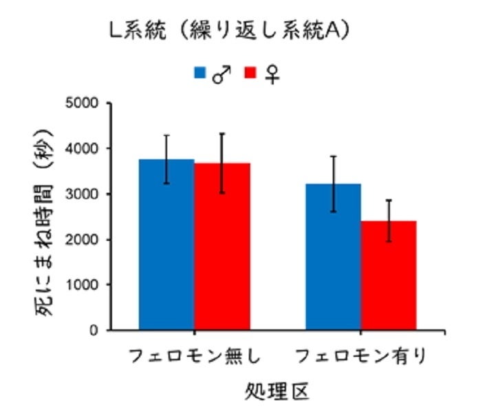 今回、死んだふりのモデル昆虫であるコクヌストモドキにおいて、集合フェロモンの存在が死んだふりから覚醒する刺激のひとつであることを世界に先駆けて示しました。