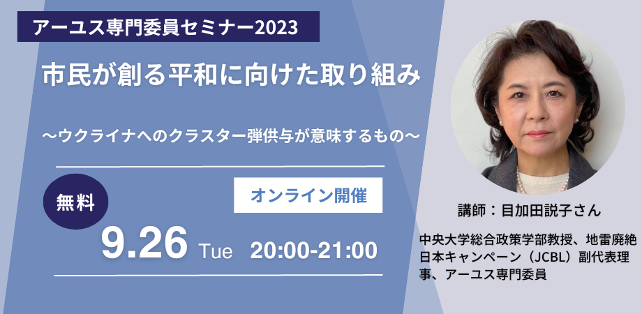 今回のセミナーでは、対人地雷の廃絶やクラスター爆弾禁止に向けた国際的な運動に関わってきた目加田説子さんから、米国のウクライナへのクラスター爆弾供与についてどのように捉えているのか。じっくりとお話を伺う機会を設けました。ぜひとも多くの方にご参加いただき、市民の目線からウクライナで起きていることについて知り、私たち日本の市民にできることは何かを考えたいと思います。