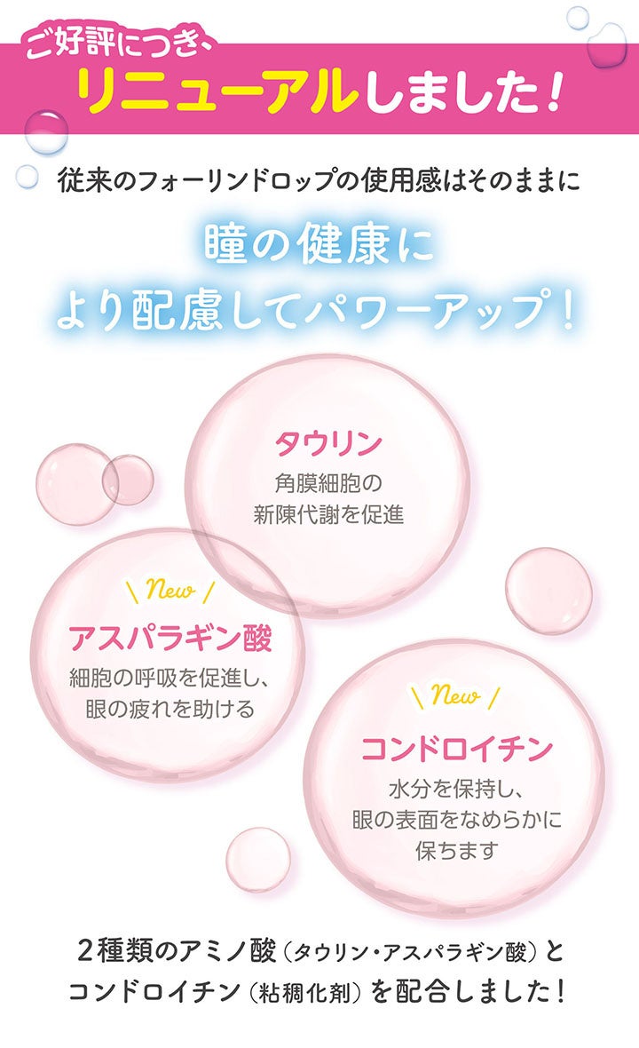新たにアスパラギン酸とコンドロイチンを配合し、従来のフォーリンドロップの使用感はそのままに、瞳の健康により配慮してパワーアップしました。
