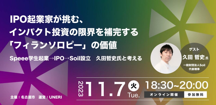 本イベントは、キャピタルゲインを元に「『儲からない』けど『意義がある』事業に取り組むスタートアップ」を対象とした助成財団を立ち上げた一般財団法人Soil代表理事の久田哲史氏をゲストとして招き、社会起業家エコシステムにIPO起業家の資金が創業初期のリスクマネーとしてスタートアップに流れるフィランソロピーの文化を根付かせることを目的に実施いたします。