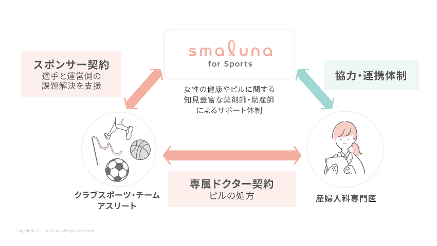 ・スマルナ for Sports 専属の産婦人科医師によるオンライン診察や医療相談、ピル処方サービスの提供 ・コンディションに合わせた個別のお悩みにスマルナ専属の薬剤師、助産師が相談受け付け(365日対応) ・座談会やセミナーの開催 |